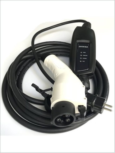 Cargador ideal para cargas de emergencia o para donde no hay un cargador instalado. Se conecta a un tomacorriente Schuko.