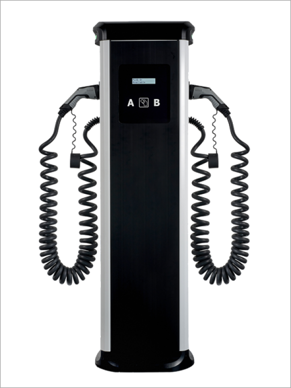 Potencia de salida de 22 kW trifásico x 2 tomacorrientes Tipo 2, lector RFID, medidor de energía integrado, CON conectividad 3G, Protección diferencial Tipo A incluida. Tipo Tótem